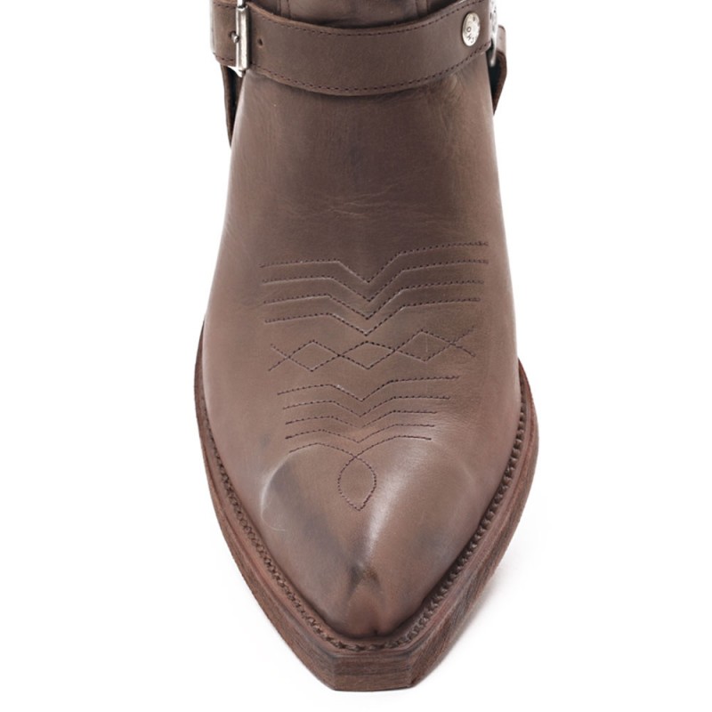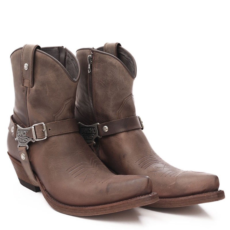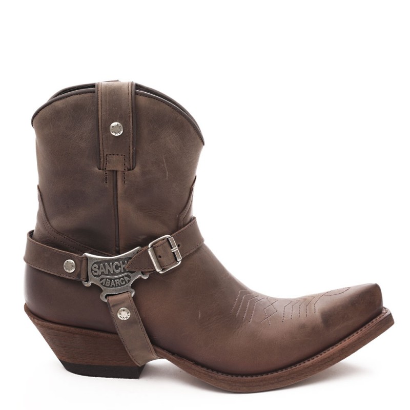 De cuero robusto marron-gris y con tacón alto y la puntera afilada, parecido a madera antigua. El bucle te facilita la entrada del piel. El botín es de muy alta calidad. Con bordados en la pala de hilo de la misma tonalidad que la piel. Lleva una espuela en color plata viejo con la marca SANCHO ABARCA BOOTS, que se puede poner y quitar de modo que nos permite marcar dos estilos con un mismo botín. Muy cómodos.
