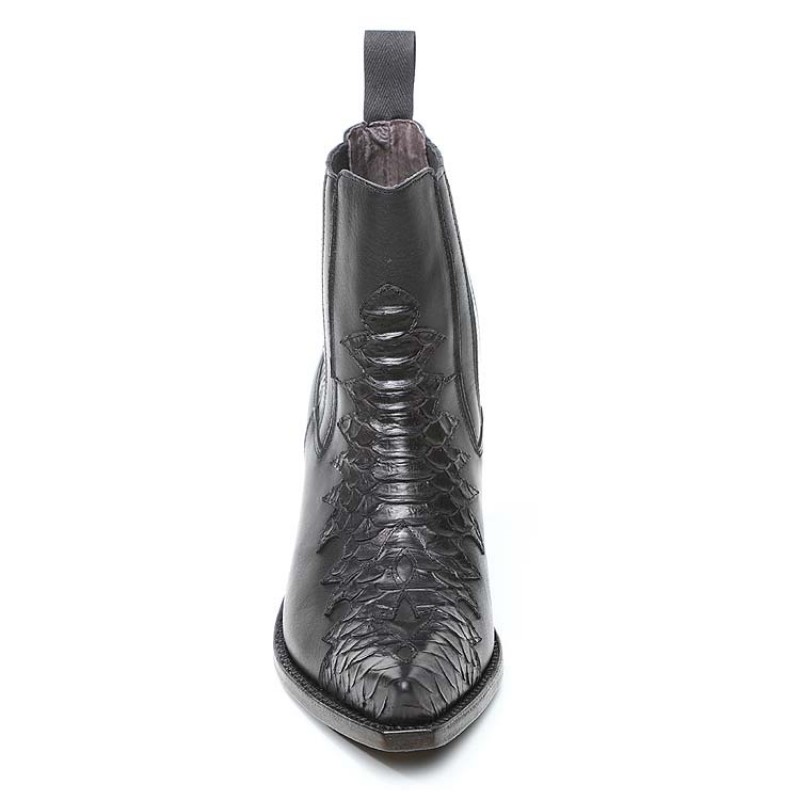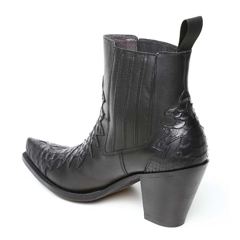 Botines de señora estilo cowgirl en piel de ternera napa con piezas en la trasera y empeine en serpiente pitón imitación estampada sobre piel de vacuno. El modelo Sancho Outlow está pensado para la mujer activa, emprendedora, profesional, que le gusta lo exclusivo y que no quiere dejar a un lado su estilo.