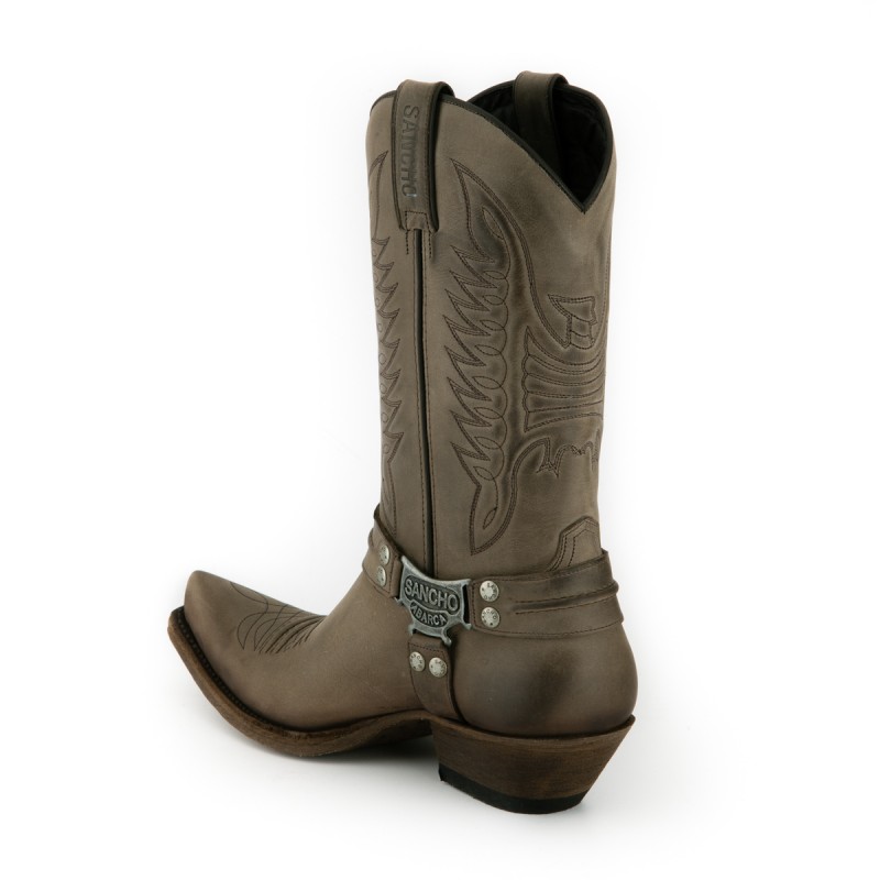Ideal para lucir con ropa vaquera. Está fabricada en piel nairobi de vacuno color ceniza. Este  modelo  presenta los clásicos bordados acolchados de la marca SANCHO en la caña y el  empeine esta resaltado por unos delgados bordones y un discreto dibujo cosido. Tiene dos trabillas en la boca de la caña que ayudan a calzar la bota y llevan grabadas a fuego la marca SANCHO.